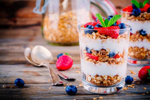 - Monta capas de yogur, fruta y granola en un vaso.